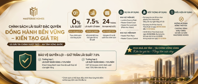 Masterise Homes công bố chính sách lãi suất cố định 7,5%/năm trong 24 tháng, ân hạn nợ gốc, bảo vệ quyền lợi toàn diện cho người mua căn hộ The Global City và các dự án trọng điểm.